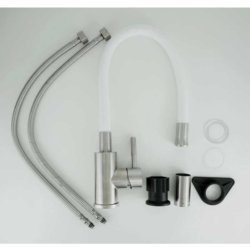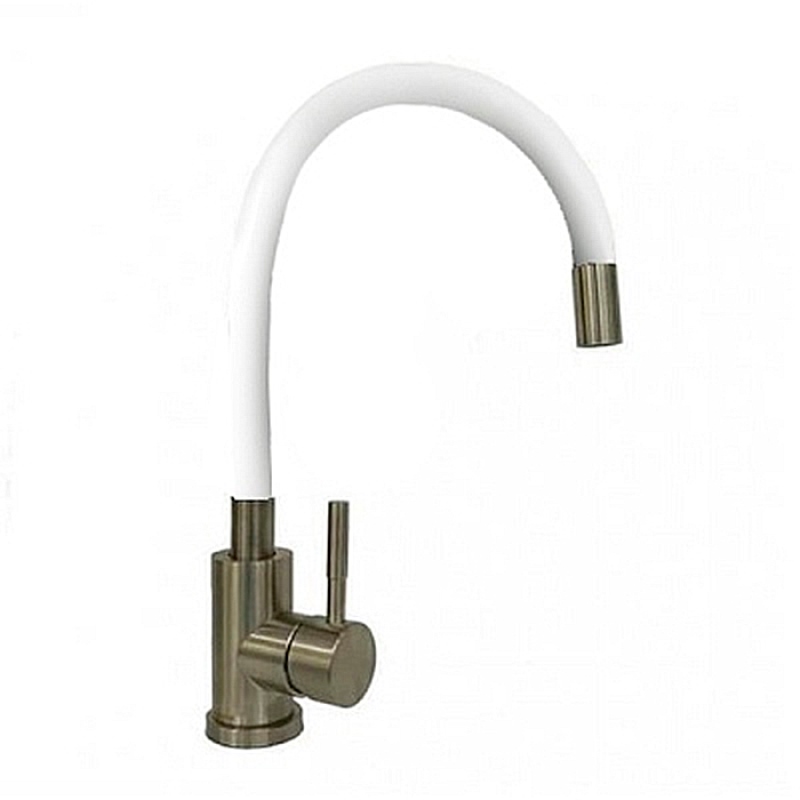 Смеситель для кухни Esko Snake K44 W имеет гибкий излив. Изготовлен из качественной латуни и имеет защитное покрытие, что способствует устойчивости к коррозии и резким перепадам температуры. Рычажное управление, горизонтальный монтаж на одно отверстие.